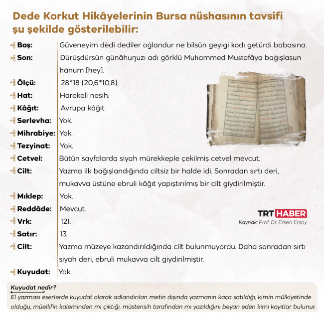 “El yazması eserlerde kuyudat olarak adlandırılan metin dışında yazmanın kaça satıldığı, kimin mülkiyetinde olduğu, müellifin kaleminden mi çıktığı, müstensih tarafından mı yazıldığını beyan eden kimi kayıtlar bulunur. Maalesef Dede Korkut hikâyelerinin Bursa nüshasında bu kayıtlardan hiçbiri bulunmuyor. Ferağ kaydı dışında adı geçen kayıtlar genellikle vikaye ya da zahriye denilen ve esas metinden önce gelen boş sayfalarda bulunur. Bu kayıtlar bulunmadığından yazmanın tam olarak tarihlendirilmesi mümkün olamamaktadır.”