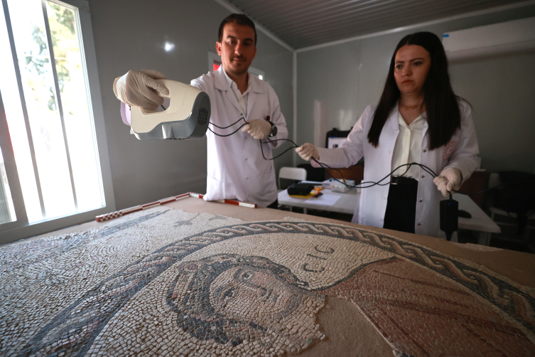 Görüntüleme, projelendirme ve tespit amaçlarıyla birçok aleti laboratuvarımıza hediye ettiler. Depremin ilk gününden beri yanımızda olan Japon halkına teşekkür ediyoruz. Laboratuvarda, müzemizin içinde küçük de olsa hasar almış taşınabilir eserlerimiz başta olmak üzere mozaik ve taş eserlerimizin onarımı gerçekleştiriliyor."