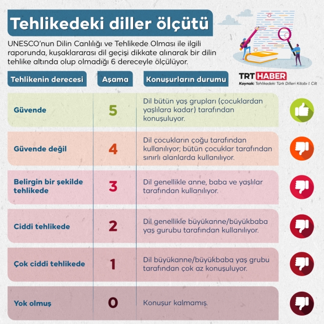 UNESCO’nun Dilin Canlılığı ve Tehlikede Olması ile ilgili raporunda, kuşaklararası dil geçişi dikkate alınarak bir dilin tehlike altında olup olmadığı 6 dereceyle ölçülüyor.