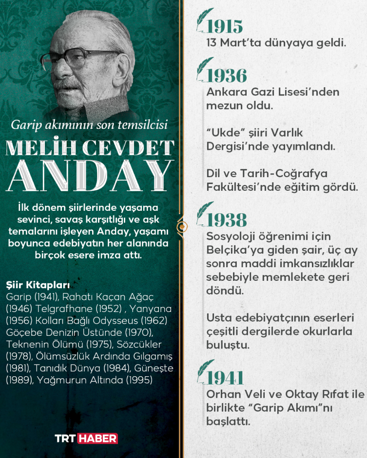 "Garip" şiir akımının son temsilcisi Melih Cevdet Anday, 13 Mart 1915'te Hatice Nadide ve İbrahim Cevdet çiftinin üçüncü çocuğu olarak Çanakkale'de dünyaya geldi.