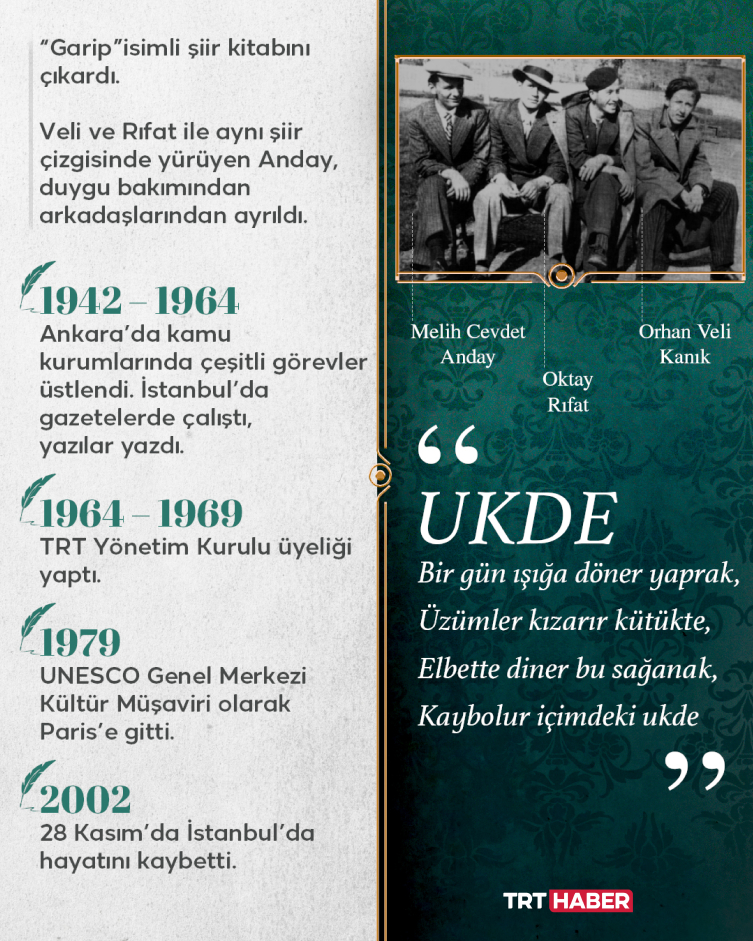 Orhan Veli, Oktay Rifat ve Anday, "Garip Akımı"nı başlattıktan sonra 1941'de "Garip" isimli şiir kitabını çıkardı. Aynı şiir çizgisinde yürüyen üç arkadaş, duygu bakımından ise birbirinden ayrıldı.