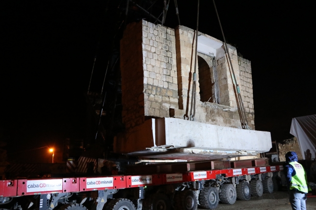 Toplam 115 ton ağırlığındaki bahçe duvarları ile caminin kapısı 48 tekerlekli SPMT aracına yüklendi.