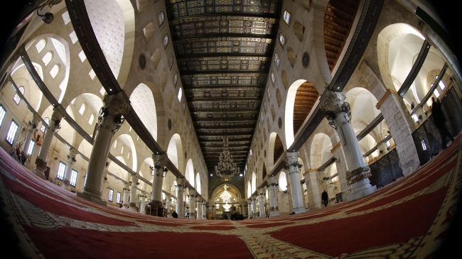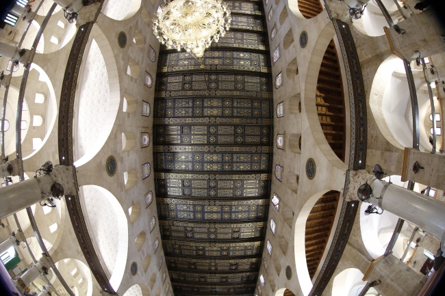 Mescid-i Aksa’nın içinden çekilen görüntülerde tavanın işlemelerinin güzelliği öne çıkıyor.
