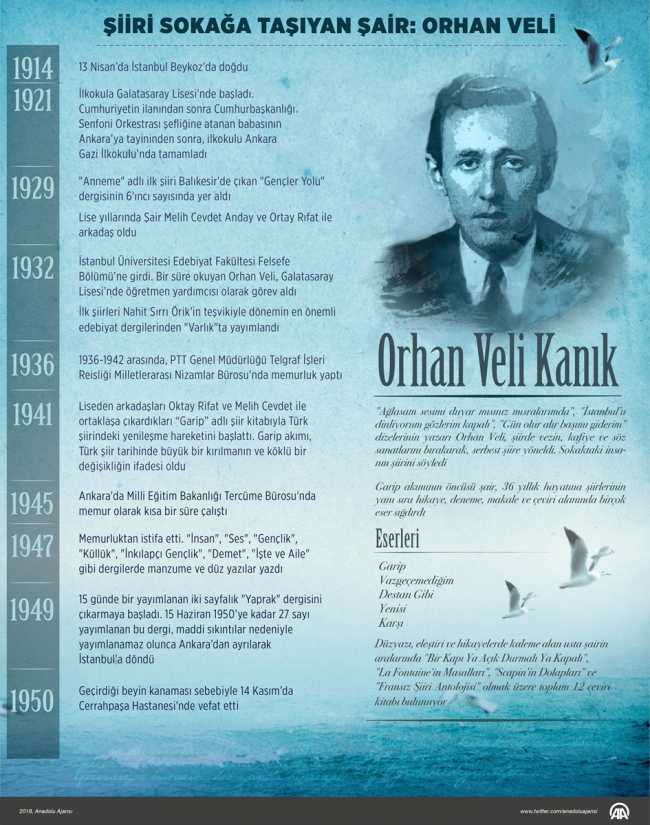 "Ağlasam sesimi duyar mısınız mısralarımda", "İstanbul’u dinliyorum gözlerim kapalı", "Gün olur alır başımı giderim" isimli şiirlerin şairi Orhan Veli, 13 Nisan 1914’te Mehmet Veli Bey ile Fatma Nigar Hanım’ın ilk çocukları olarak Beykoz Yalıköy’de dünyaya geldi.