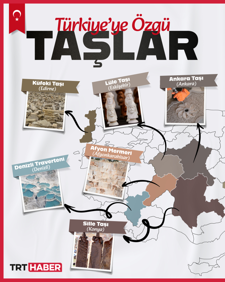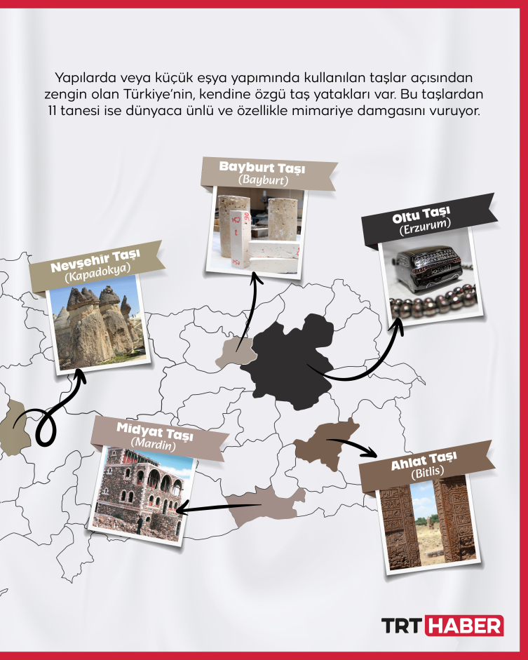 Türkiye, yapılarda kullanılan bu taşlar açısından dünyanın en şanslı ülkeleri arasında yer alıyor. Türkiye’ye özgü kimisi küçük eşyaların yapımında kimisi de mimari eserlerde kullanılan 11 ayrı taş türü var. Bunlar lüle Taşı, Oltu Taşı, Ankara Taşı, Sille Taşı, Küfeki Taşı, Nevşehir Taşı, Ahlat Taşı, Midyat Taşı, Bayburt Taşı ve Denizli Traverteni olarak sıralanıyor.