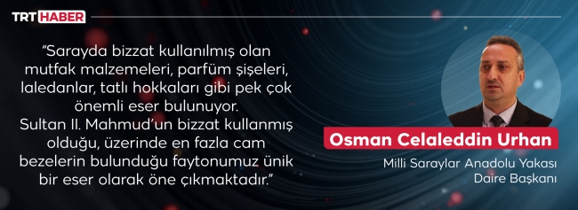 “Sarayda bizzat kullanılmış olan mutfak malzemeleri, parfüm şişeleri, laledanlar, tatlı hokkaları gibi pek çok önemli eser bulunuyor. Sultan II. Mahmud’un bizzat kullanmış olduğu, üzerinde en fazla cam bezelerin bulunduğu faytonumuz ünik bir eser olarak öne çıkmaktadır. Yine kristal piyanomuz ve 19. yüzyılda önemli devlet adamlarını ağırlamak için kurulan saray sofrasının birebir örneği ziyaretçilerimiz tarafından görülebilir.”