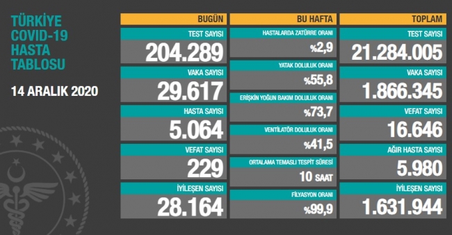 Son 24 saatte 229 hasta vefat etti, 28 bin 164 hasta ise iyileşti. Toplam test sayısı 21 milyon 284 bin 5, toplam hasta sayısı 1 milyon 866 bin 345, toplam vefat sayısı 16 bin 646, toplam ağır hasta sayısı 5980, hastalarda zatüre oranı %2.9, toplam iyileşen sayısı ise 1 milyon 631 bin 944 oldu.