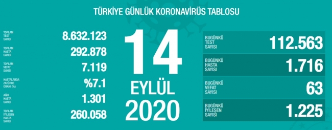 Sağlık Bakanlığı 14 Eylül koronavirüs vaka tablosunu açıkladı. "Türkiye Günlük Koronavirüs Tablosu"nun güncel verilerine göre, bugün 112 bin 563 test yapıldı. Bu kapsamda 1716 kişiye COVID-19 tanısı konuldu. Bugünkü iyileşen hasta sayısı ise 1225.