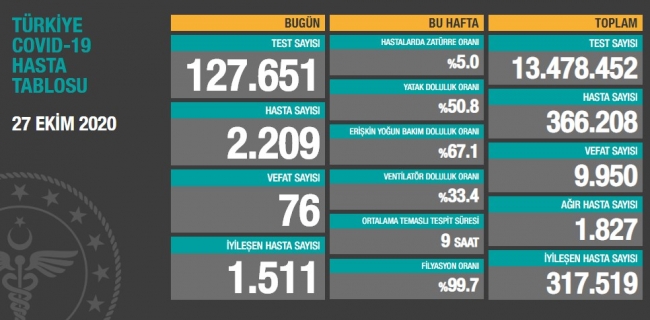 Son 24 saatte 76 hasta vefat etti, 1511 hasta ise iyileşti. Toplam test sayısı 13 milyon 478 bin 452, toplam vaka sayısı 366 bin 208, toplam vefat sayısı 9 bin 950, toplam ağır hasta sayısı 1827, hastalarda zatüre oranı %5, toplam iyileşen hasta sayısı ise 317 bin 519 oldu.
