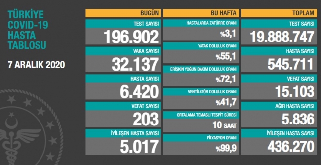 Son 24 saatte 203 hasta vefat etti, 5017 hasta ise iyileşti. Toplam test sayısı 19 milyon 888 bin 747, toplam hasta sayısı 545 bin 711, toplam vefat sayısı 15 bin 103, toplam ağır hasta sayısı 5836, hastalarda zatüre oranı %3.1, toplam iyileşen hasta sayısı ise 436 bin 270 oldu.