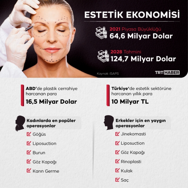 Dünyada estetik sektörünün 2021 piyasa büyüklüğü: 64,6 milyar dolar. En fazla ameliyat yapılan ülkelerin başında ise ABD ve Brezilya geliyor. Peki ülkemiz?