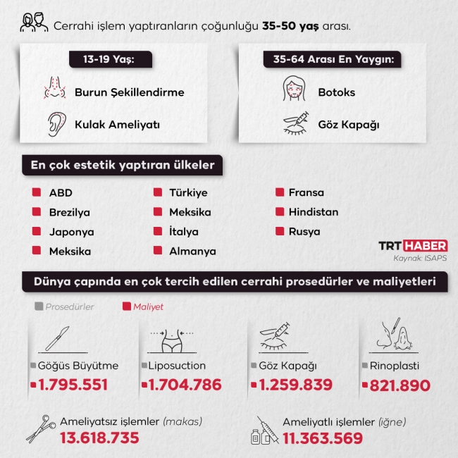 [(Grafik: TRT Haber / Nursel Cobuloğlu)]Estetiğin en çok yapıldığı ülkeler arasında Türkiye ilk 10’un içinde. Türkiye estetik sektörüne yılda 10 milyardan fazla para harcıyor. Üstelik estetik yaşı gittikçe düşüyor.