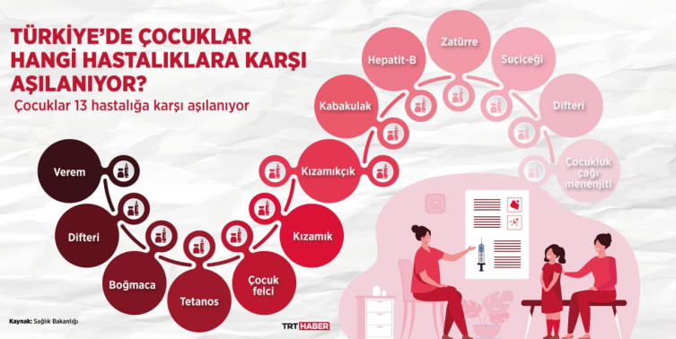 Türkiye’de çocuklar Sağlık Bakanlığı’nın belirlediği takvim doğrultusunda 13 hastalığa karşı rutin olarak aşılanıyor. Bu hastalıklar şöyle sıralanıyor: Verem, difteri (kuşpalazı), boğmaca, tetanos, çocuk felci, kızamık, kızamıkçık, kabakulak, hepatit-B, hepatit-A, zatürre, suçiçeği ve çocukluk çağı menenjiti.