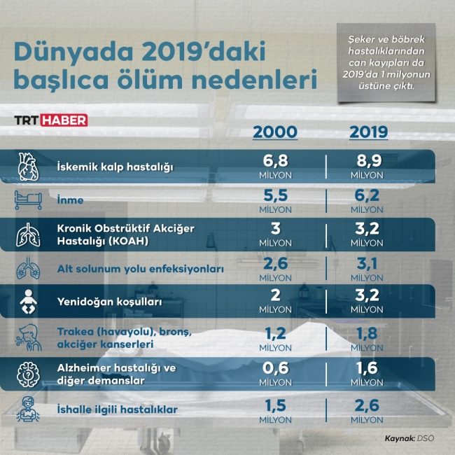 Buna göre, ilk 10 ölüm nedeninin 7’si bulaşıcı olmayan hastalıklar ve geçen yıl kaydedilen 55,4 milyon vefatın yüzde 55'ini de bunlar oluşturdu.