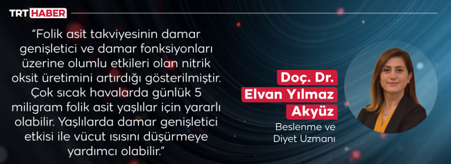 Sağlık Bilimleri Üniversitesi Beslenme ve Diyetetik Bölümü Beslenme ve Diyet Uzmanı Doç. Dr. Elvan Yılmaz Akyüz, özellikle yaşlılarda damar yapısının bozulması sebebiyle sıcak havalarda kan akışının düzgün olmadığını söylüyor. Bunun için günlük folat (folik asit) tüketiminin önemine de işaret ediyor: