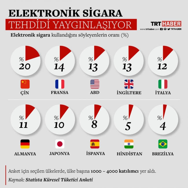 İstatistik portalı Statista’nın küresel tüketici anketinden elde edilen verilere göre, elektronik sigara kullanımı en çok Çin’de yaygın. Bu ülkede sigara içen her 5 kişiden 1’i, ayrıca elektronik sigara da kullandığını söylüyor.