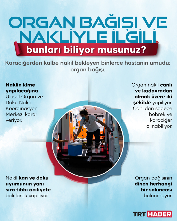 [Grafik: TRT Haber]Organ nakillerinin daha fazla insana ulaşabilmesi ve bekleyen her hastaya yeni bir umut doğurabilmesi için bağış oranlarının yükselmesi kritik önem taşıyor. Sağlık Bakanlığı, bağış sürecini kolaylaştırmak ve organ bekleyen hastaların sayısını azaltmak için birçok kamu ve özel sağlık kuruluşunda bağış imkanı sunuyor.
