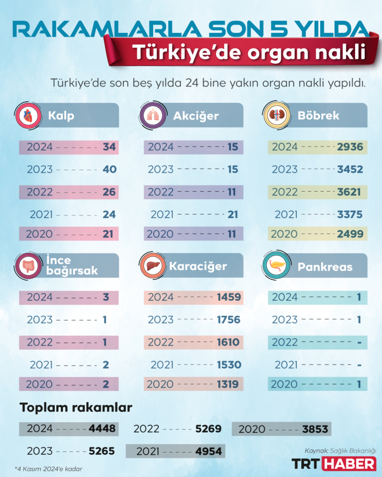 Sağlık Bakanlığı verilerine göre son 5 yılda 23 bin 789 organ nakli yapıldı. Sadece 2024 yılının başından 25 Ekim’e kadar geçen sürede Türkiye genelinde 4 bin 448 hastaya organ nakli gerçekleştirildi. Bu nakillerin 2 bin 936 gibi büyük bir kısmını böbrek nakli oluşturdu. Aynı dönemde bin 459 karaciğer nakli gerçekleştirildi. Kalp nakli bekleyen hastalardan ise yalnızca 34’ü, nakil şansına kavuştu. Bunun yanı sıra 15 akciğer, 3 ince bağırsak ve 1 pankreas nakli bu yıl içinde yapıldı.