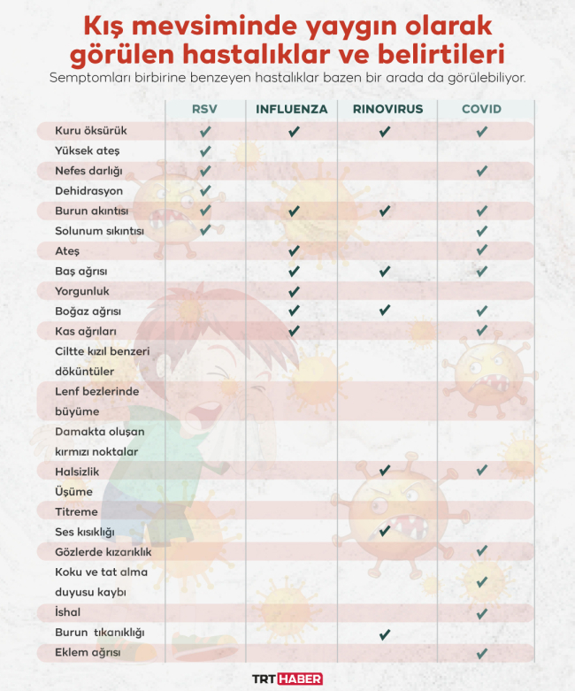 Kış mevsimiyle birlikte gelen soğuk hava ve kapalı mekanlarda daha fazla zaman geçirilmesi bu hastalıkların görülme sıklığını artırıyor.Üstelik gribin yanı sıra, daha ziyade çocukları etkileyen respiratuvar sinsityal virüs (RSV), soğuk algınlığına sebep olan rinovirüs ve COVID-19 da yaygın olarak görülen hastalıklar arasında.