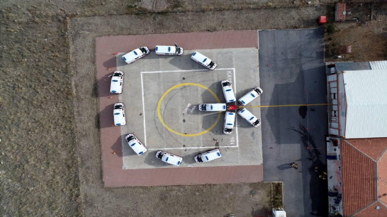İl Sağlık Müdürlüğü helikopter pistinde düzenlenen devir teslim programında, 13 ambulansla ay ve yıldız koreografisi oluşturuldu.