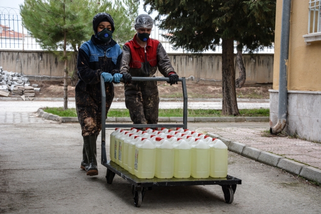 Yaklaşık 5 yıldır okulda sıvı ve köpük sabun, yüzey temizleyici, cam sil ve çamaşır suyu, ağır kir ve yağ çözücü, otomat temizleyici, sıvı bulaşık deterjanı gibi çok sayıda temizlik malzemesi üreten Malatya'daki Hasan Akbudak İMKB Mesleki ve Teknik Anadolu Lisesi Kimya Teknolojisi Bölümü öğrencileri, son günlerde yoğun mesaide.