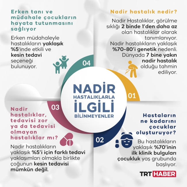 Dünya Sağlık Örgütüne göre, görülme sıklığı 2 binde 1’den daha az olan hastalıklar 'nadir hastalık' olarak tanımlanıyor. Dünyada 7 bine yakın nadir hastalık var. Yaklaşık yüzde 80'i genetik kökenli olan bu hastalıkların büyük kısmı çocuk yaş grubunda ortaya çıkıyor. Bu çocukların 3'te 1, beş yaşına gelmeden hayatını kaybediyor. Erken tanı ve müdahale ise hayat kurtarıyor. Türkiye'de 2015 yılından beri faaliyet gösteren Nadir Hastalıklar Derneği bünyesinde çok sayıda akademisyen, erken tanıdan sosyal desteğe, ailelerin ihtiyaç duyabileceği alanlarda kamu kurum ve kuruluşlarıyla iş birliği içinde faaliyet yürütüyor. Nadir Hastalıklar Derneği Yönetim Kurulu Başkanı Prof. Dr. Ayşegül Neşe Çıtak Kurt, TRT Haber'in sorularını cevapladı.