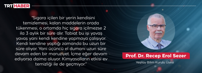 “Tabiat bu işi yavaş yavaş yani kendi kendine yapmaya çalışıyor. Kendi kendine yaptığı zamanda bu uzun bir süre alıyor. Yani üçüncü el dumanı uzun süre devam eden bir maruziyet. İçme eğer devam ediyorsa daima oluyor. Kimyasalların etkisi ev temizliği ile de geçmiyor.”