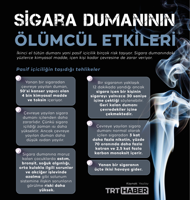 Bir sigara yaklaşık 12 dakika yanıyor, kişi sigarayı sadece 30 saniye içine çekiyor. Geri kalan dumanı ise çevredekiler soluyor. Çevreye yayılan sigara dumanı normal olarak içilen sigaradan 3 kat daha fazla nikotin, yüzde 70 daha fazla katran ve 2,5 kat fazla karbon monoksit içeriyor.
