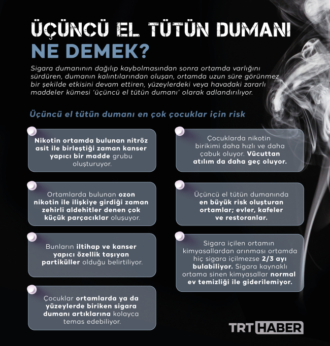 Üçüncü el tütün dumanı sigara içilen her yerde birikiyor. Ancak evlerde birikmesi en korkutucu olanı. Çünkü sigara kullanmayanlar da sigaradan kaynaklı kimyasallara maruz kalıyor. Prof. Dr. Sezer üçüncü el tütün dumanının ev ortamında çocuklara etkisini şu sözlerle anlatıyor: