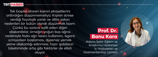 Stresin sağlık üzerindeki etkilerinin önceden sadece hekimler tarafından fark edildiğini ancak özellikle son dönemde hastaların da “acaba stresten mi?” diye düşünmeye başladığını ifade eden Prof. Dr. Kara, “Kişinin stresle baş etme yolları, vücudunun strese karşı verdiği fizyolojik yanıt önemli. Her bireyde mide rahatsızlığı gelişmiyor. Kişinin stresli dönemde edindiği birtakım alışkanlıklar ya da bu alışkanlıklardaki artış da buna zemin hazırlayabiliyor" diyor.