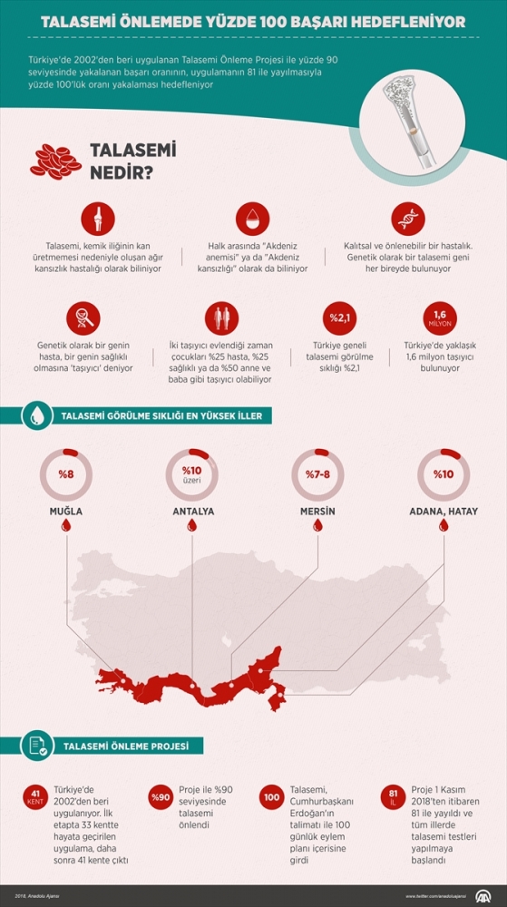 "Kentlerde eğitim, tarama, genetik danışma, doğum öncesi tanı testleri ve iki çiftin genleri ayıklanarak tüp bebek sistemi ile çocuk sahibi yapma çalışmalarını gerçekleştiriyoruz. Proje ile yüzde 90 seviyesinde talasemi önlendi. Talasemi, Cumhurbaşkanımız Recep Tayyip Erdoğan'ın talimatı ile 100 günlük eylem planı içerisine girdi. Proje 1 Kasım 2018'ten itibaren ise 81 ile yayıldı ve tüm illerde talasemi testleri yapılmaya başlandı. Evlenen çiftler bu testleri yaptırıp nikah dairesine gidiyor. Bu da yüzde 100'lük bir başarı sağlayacaktır. Talaseminin eylem planına alınması bizi sevindirdi."