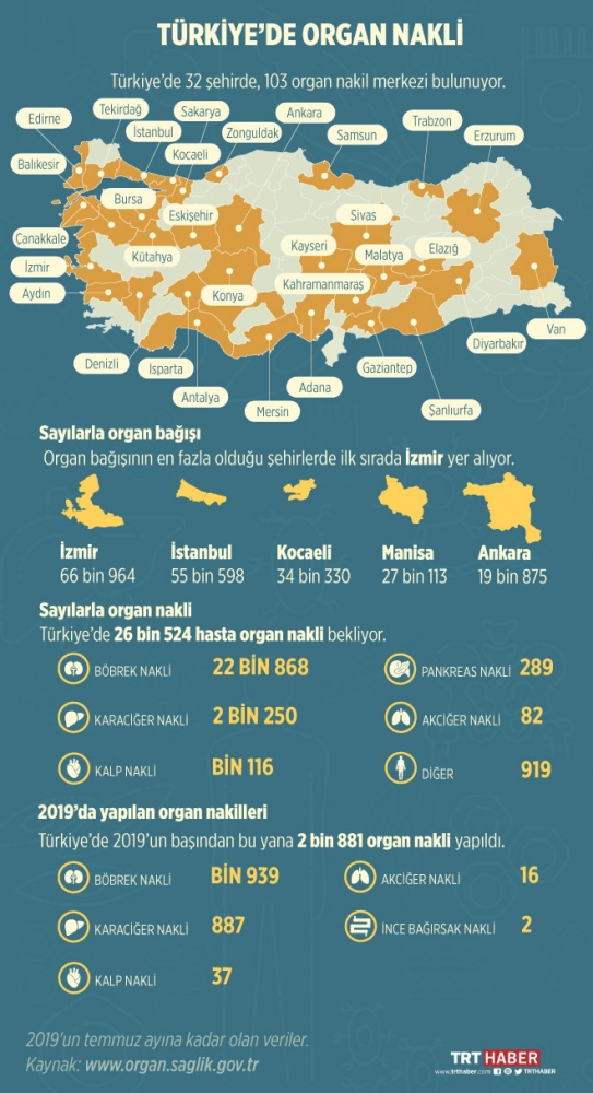 Organ nakli bekleyen hasta sayısı Temmuz 2019 verilerine göre 26 bin 524… Bunların 22 bin 868’i, yani çok büyük kısmı böbrek nakli bekleyen hastalar. 2250 kişi karaciğer, 1116 kişi kalp ve 289 kişi pankreas nakli bekliyor. Organ nakli konusunda titiz bir çalışma yürütülüyor. Bu işlem her hastanede yapılamıyor. Türkiye’de 32 şehirde, 103 organ nakli merkezinde bu önemli operasyonlar gerçekleştiriliyor. Beyin ölümü gerçekleşen bir hastanın organlarının kime nakledileceğine, Ulusal Organ ve Doku Nakli Koordinasyon Merkezi karar veriyor. Koordinasyon Merkezi, veri tabanındaki bilgiler ışığında kime hangi organın nakledileceğini kararlaştırıyor.