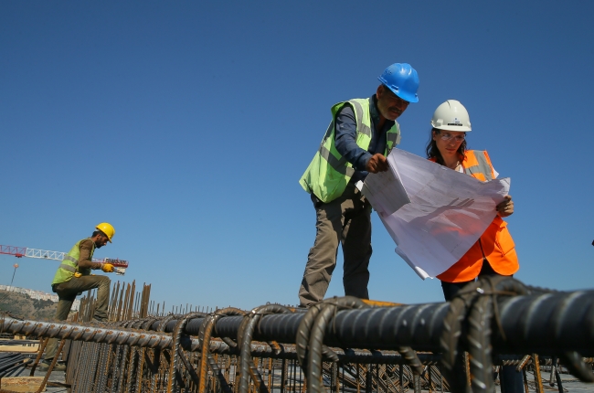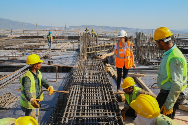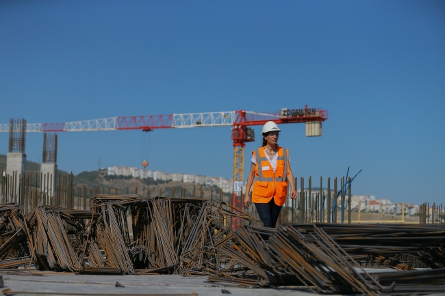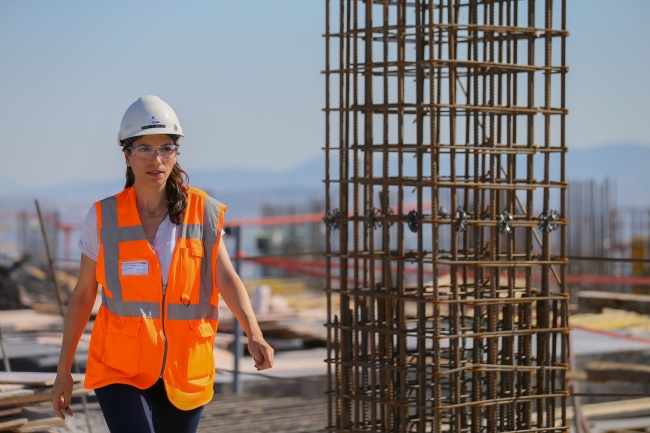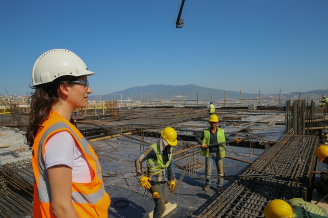 Türkiye'nin 3'üncü büyük şehir hastanesi olan İzmir Bayraklı Entegre Sağlık Kampüsü inşaatında yüzlerce erkek çalışanın yanında sayılı kadın çalışan arasında yer alan Seda Girişen Sömek, çalışmaların mimariye olan yansımasını büyük bir titizlikle gerçekleştiriyor.
