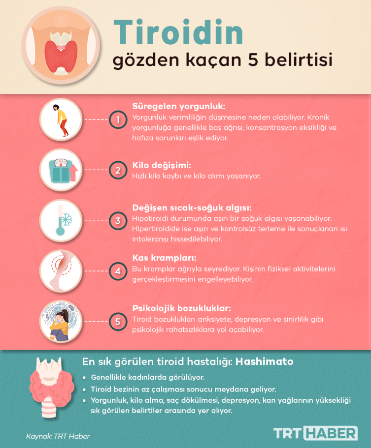 Tiroid bezinin gerektiği gibi çalışmaması sonucu ortaya çıkan bozukluklar birçok belirti ile kendini ele veriyor. Ancak bu belirtiler bazen başka nedenlere bağlanarak bazen de ihmal edilerek hastalığı atlamaya, geç tanıya ya da tam tedavi edilememeye neden olabiliyor.