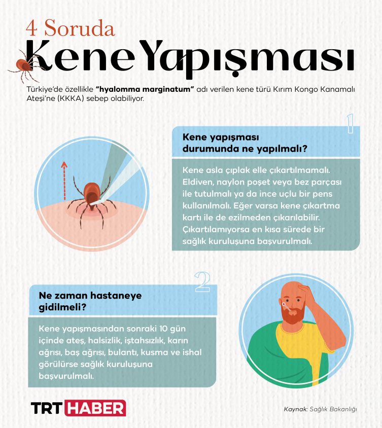 Peki kene yapışması durumunda ne yapılması gerekiyor? Hangi durumlarda sağlık kuruluşlarına başvurulmalı? Kırım Kongo Kanamalı Ateşi’nin belirtileri neler? Sağlık Bilimleri Üniversitesi Haydarpaşa Numune Hastanesi Enfeksiyon Hastalıkları Uzmanı Doç. Dr. Asuman İnan TRT Haber’e anlattı.
