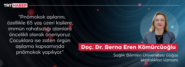 “Bakteriyel pnömokok aşılarına genel olarak 'zatürre aşıları' diyoruz. Pnömokok aşılarını, özellikle 65 yaş üzeri kişilere, immün rahatsızlığı olanlara öncelikli olarak öneriyoruz. Çocuklara ise zaten örgün aşılama kapsamında pnömokok yapılıyor.”