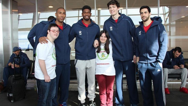 Atatürk Hava Limanı Dış Hatlar Gidiş Terminali'ne Anadolu Efes teknik kadrosu ve oyuncularıyla gelen Down Sendromlu gençler, "21 Mart Dünya Down Sendromu Günü kutlu olsun" yazılı pankart açtı.