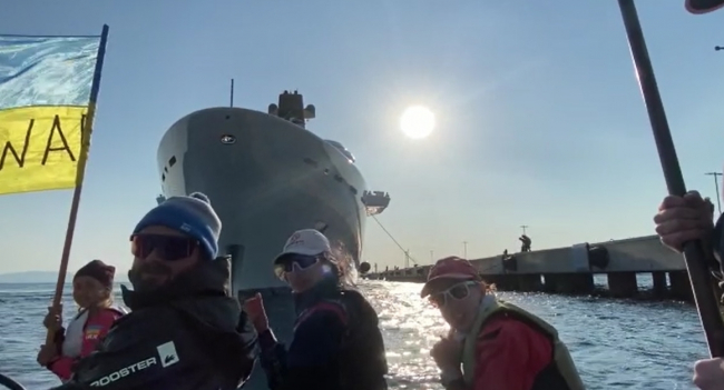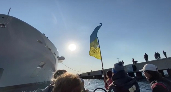 Cep telefonuyla kaydettikleri protestoda, şişme botla yatın çevresinde dolaşan yelkenciler İngilizce "Savaşa hayır" yazılı Ukrayna bayrağı açtı, "Rus gemisi buradan git" sloganı attı.