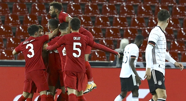 [Fotoğraf: AA]ALMANYA YİNE ETKİLİ GELDİ 41. dakikada Waldschmidt'in ceza yayı üzerinden çektiği şutunu kaleci Mert kornere çeldi.