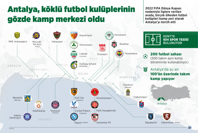 Antalya, 2022 FIFA Dünya Kupası nedeniyle liglere verilen arada, birçok ülkeden futbol kulüplerinin kamp merkezi olarak öne çıkıyor.