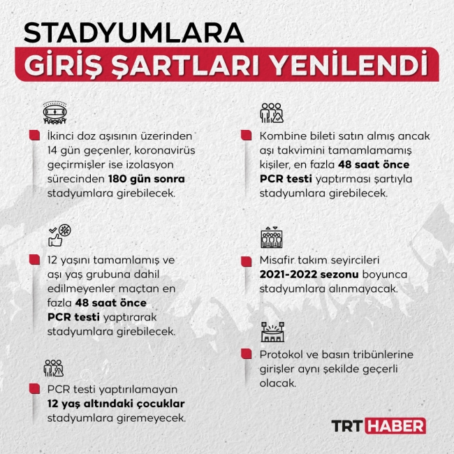 Kombine bilet satın almış ancak aşı takvimini tamamlamamış kişiler, müsabakadan en fazla 48 saat önce PCR testi yaptırması ve test sonucunun negatif olması şartıyla stadyumlara girebilecek.