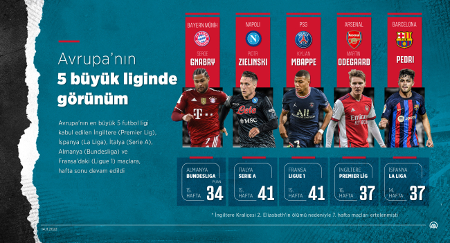 İngiltere'de Arsenal, İspanya'da Barcelona, İtalya'da Napoli, Almanya'da Bayern Münih, Fransa'da ise Paris Saint-Germain (PSG), puan tablosunun zirvesinde yer aldı.