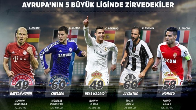 İngiltere'de Chelsea, Almanya'da Bayern Münih, İspanya'da Real Madrid, İtalya'da Juventus, Fransa'da ise Monaco bu hafta da zirvedeki yerlerini bırakmadı.