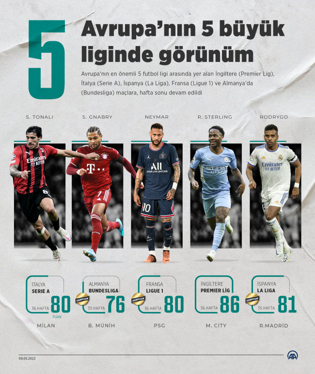 Almanya'da Bayern Münih, Fransa'da Paris Saint-Germain (PSG), İspanya'da Real Madrid'in şampiyonluğu garantilediği liglerde, İngiltere'de Manchester City, İtalya'da ise Milan, puan tablosunun zirvesinde yer almaya devam etti.