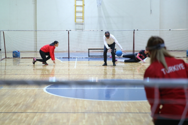 [Fotoğraf: AA]2020 Tokyo Paralimpik Oyunları'na takım halinde kota alma hakkı elde eden Kadın Golbol Milli Takımı'nın antrenmanını da takip eden Bakan Kasapoğlu, sporcuların daveti üzerine sahaya çıkarak millilerle golbol oynadı.