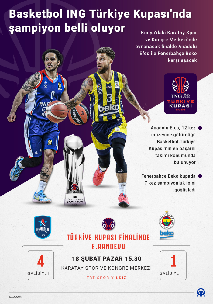 Türkiye Kupası finalinde Anadolu Efes ile Fenerbahçe Beko, 6. kez rakip olacak. İki takım arasında oynanan 5 finalin 4'ünü lacivert-beyazlılar, 1'ini ise sarı-lacivertliler kazanarak şampiyonluğa ulaştı.