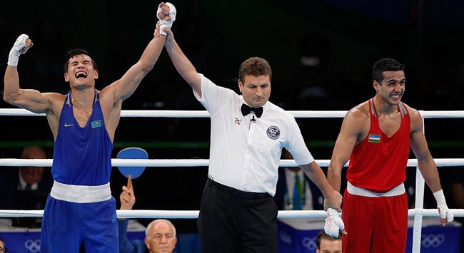 Brezilya'nın Rio de Janeiro kentindeki Riocentro'da yapılan 69 kilo boks maçı finalinde, Kazak Daniyar Yeleussinov ile Özbek Shakhram Giyasov karşılaştı.
