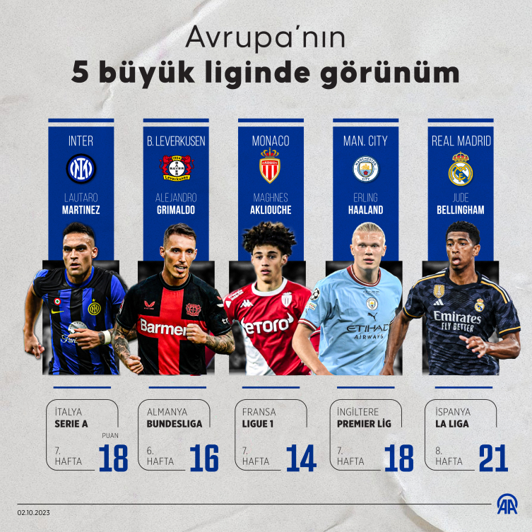 İngiltere'de Manchester City, İspanya'da Real Madrid, İtalya'da Inter, Almanya'da Bayer Leverkusen, Fransa'da ise Monaco, puan tablosunun zirvesinde yer aldı.