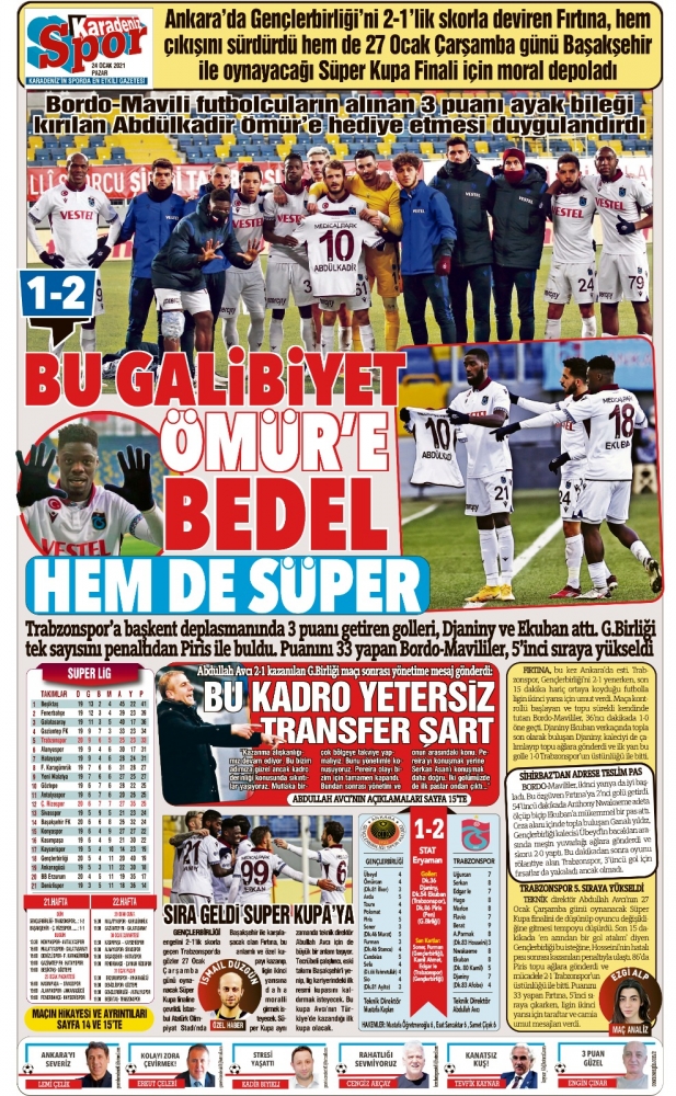 Karadeniz Gazetesi, "Bordo mavili futbolcuların alınan 3 puanı ayak bileği kırılan Abdülkadir Ömür’e hediye etmesi duygulandırdı; Bu Galibiyet Ömür’e Bedel Hem de Süper”, Günebakış Gazetesi "Abdullah Avcı ile farklı bir kimliğe bürünen bordo mavililer Gençlerbirliği deplasmanından da istediğini alarak döndü; Trabzon Fırtınası”, Taka Gazetesi “Başkent deplasmanında Djanıny ve Ekuban’ın golleriyle 3 puanı hanesine yazdıran fırtına, zirvedeki rakiplerinin ensesine yapıştı; Ankara Havası Değil Kolbastı” başlıklarını kullandı.