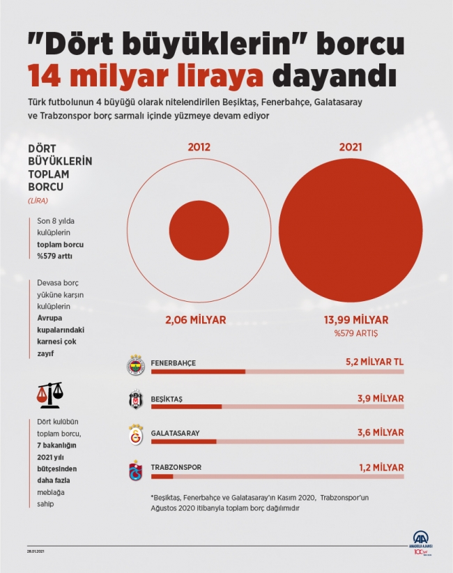 Beşiktaş, Fenerbahçe ve Galatasaray’ın Kasım 2020, Trabzonspor’un ise Ağustos 2020 itibarıyla toplam borcu 14 milyar liraya ulaşmış durumda.